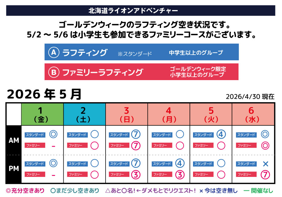 ゴールデンウィーク中のラフティングの予約状況です。(2026/4/30現在)