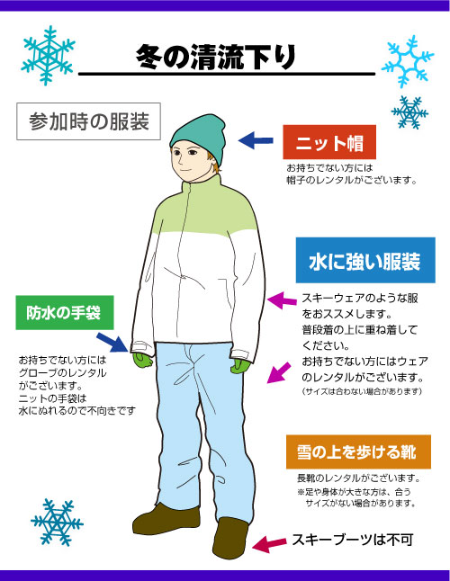 持ち物 | 防寒着、帽子、手袋、あれば長靴などの防水性のある靴をお持ちください ※お持ちでない方にはスキーウェアや長靴のレンタルがありますが、サイズや数に限りがありますので、事前にお問合せ下さい。 |